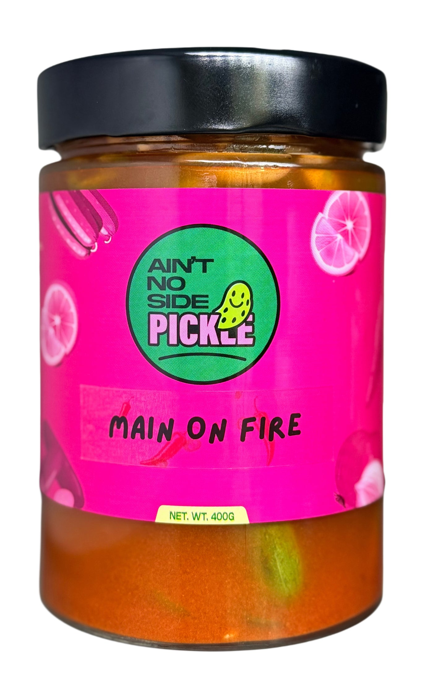 Main on Fire takes our classic whole pickled cucumbers and turns up the dial. Ghost pepper. Bird's eye chili. Kashmiri heat. This isn't a side dish. It's the main event with fire.